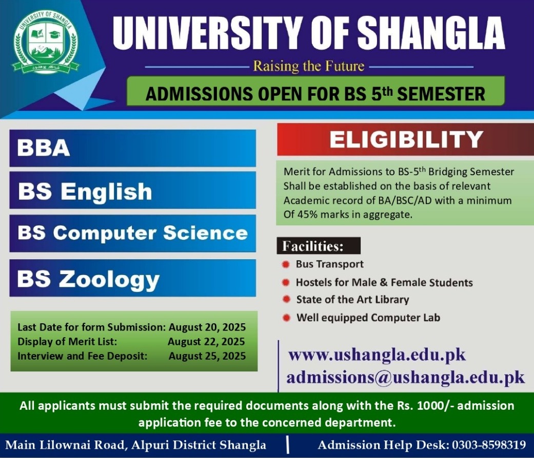 BS 5th Semester admissions are open in the following programs.