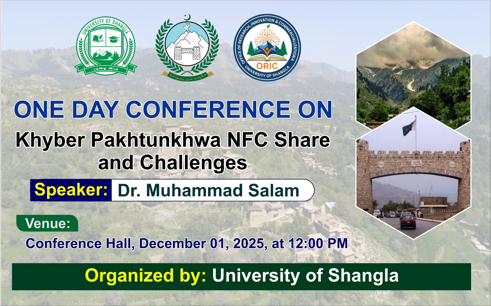 As per the directives of the Higher Education Department (HED), the University of Shangla organized a one-day conference on ‘Khyber Pakhtunkhwa NFC Share and Challenges’ for the faculty, staff & students of the University of Shangla on December 01, 2025, at 12:00 PM. The speaker of the conference was Dr. Muhammad Salam (PhD in Economics).