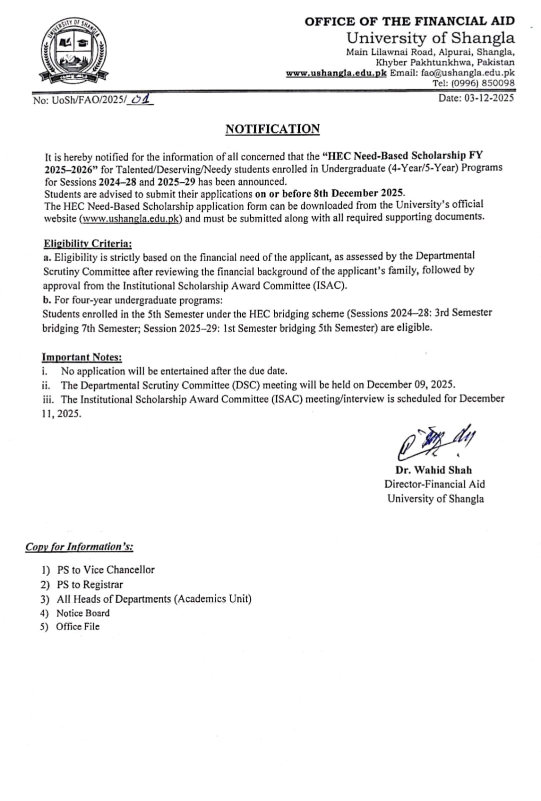 HEC Need Based Scholarships for the Session 2024-28 and 2025-29