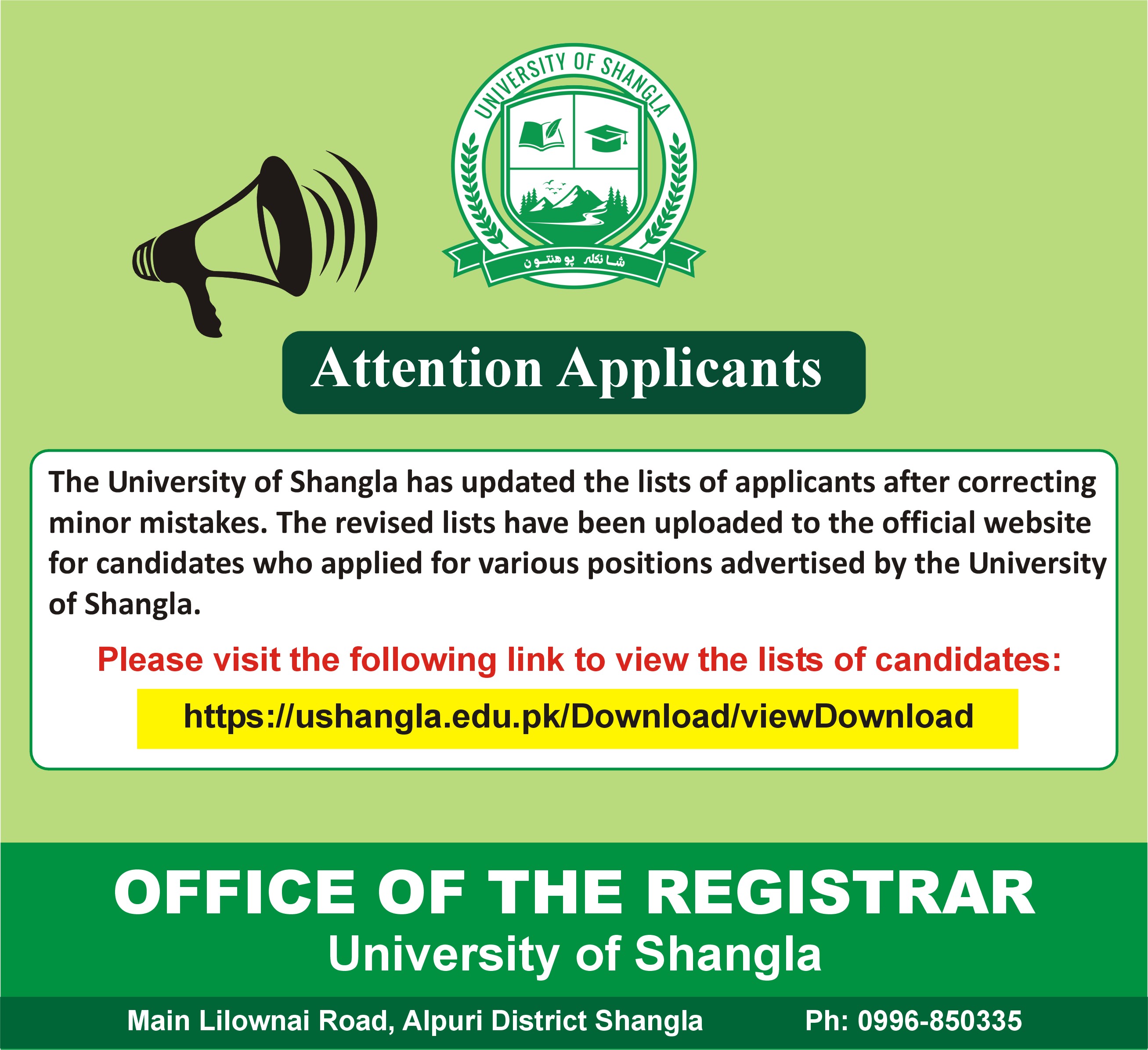The University of Shangla has updated the lists of applicants after correcting minor mistakes. The revised lists have been uploaded to the official website for candidates who applied for various positions advertised by the University of Shangla.